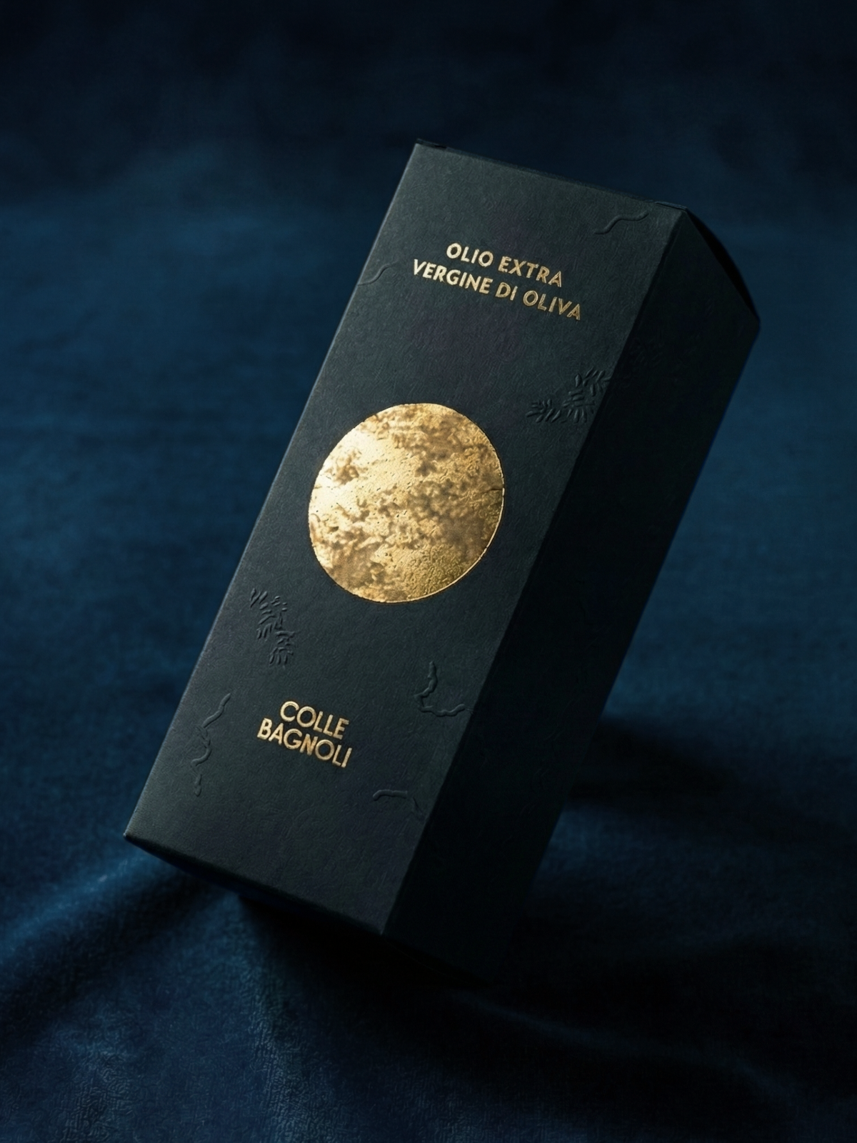 Realizzata in cartoncino rigido, la scatola presenta una finitura soft-touch blu profondo con rilievi ispirati alle colline di Bagnoli e stampe dorate a caldo che evocano il calore del sole e la preziosità del nostro “oro verde”.